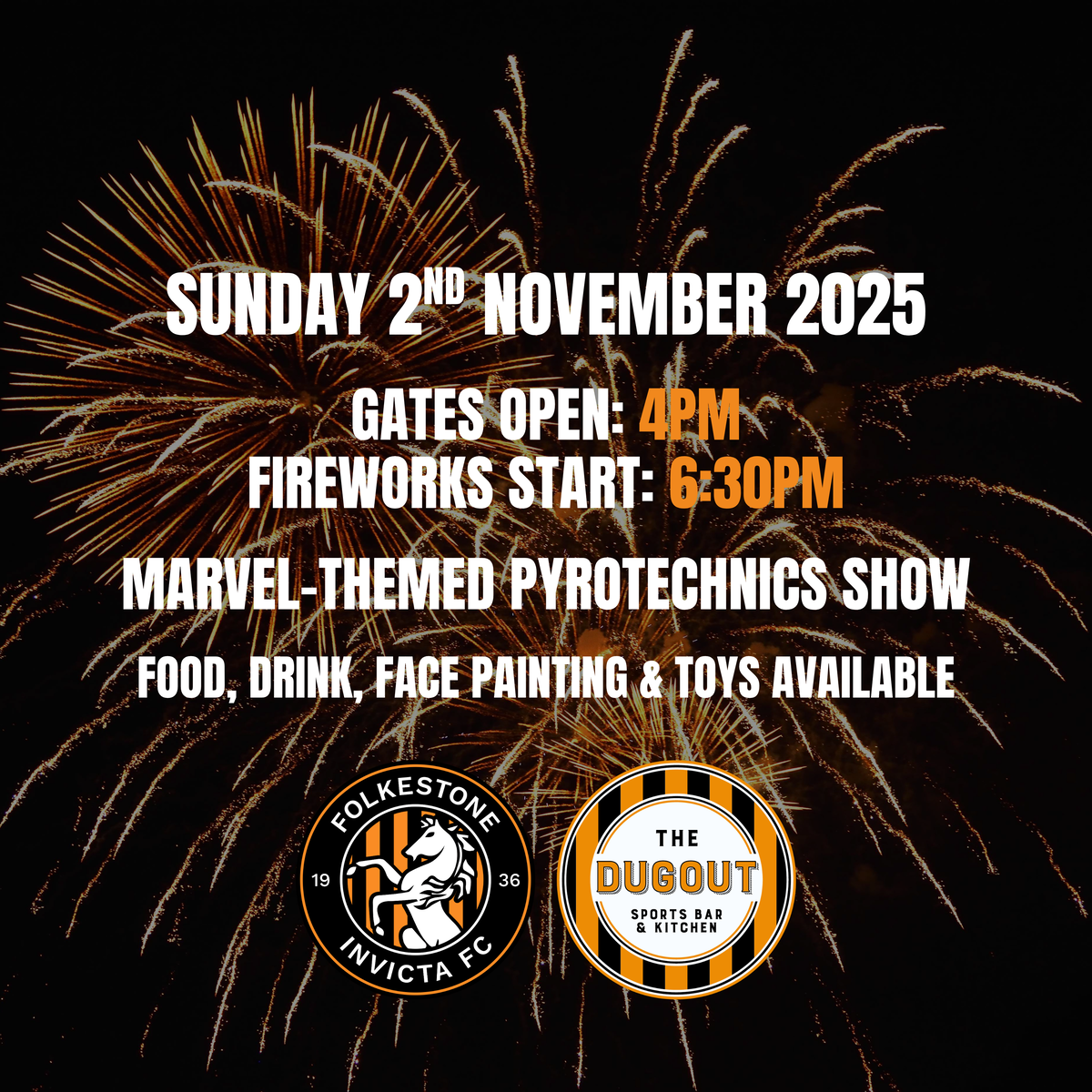 Folkestone Invicta Football Club is back – bigger and better – with our annual Fireworks Night at the Alcaline Stadium on Sunday 2nd November at 6:30pm. Join us for a marvel-themed pyrotechnics show like no other!